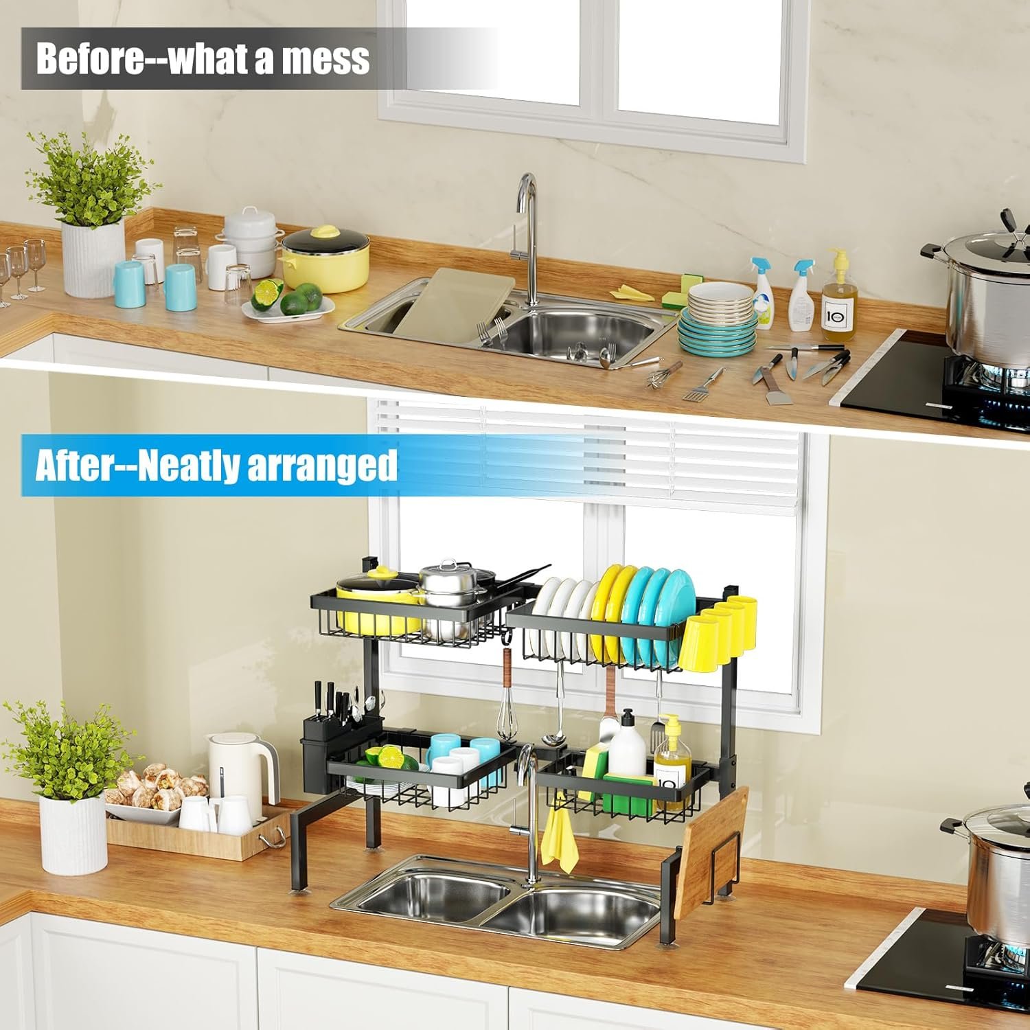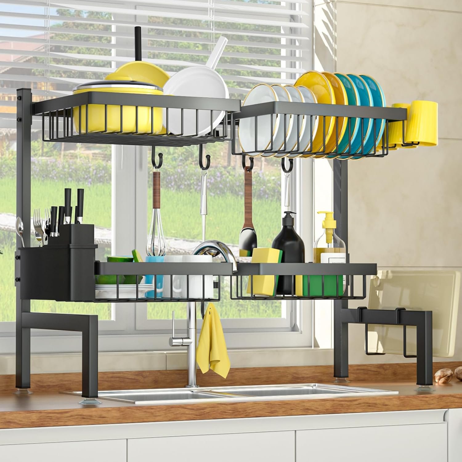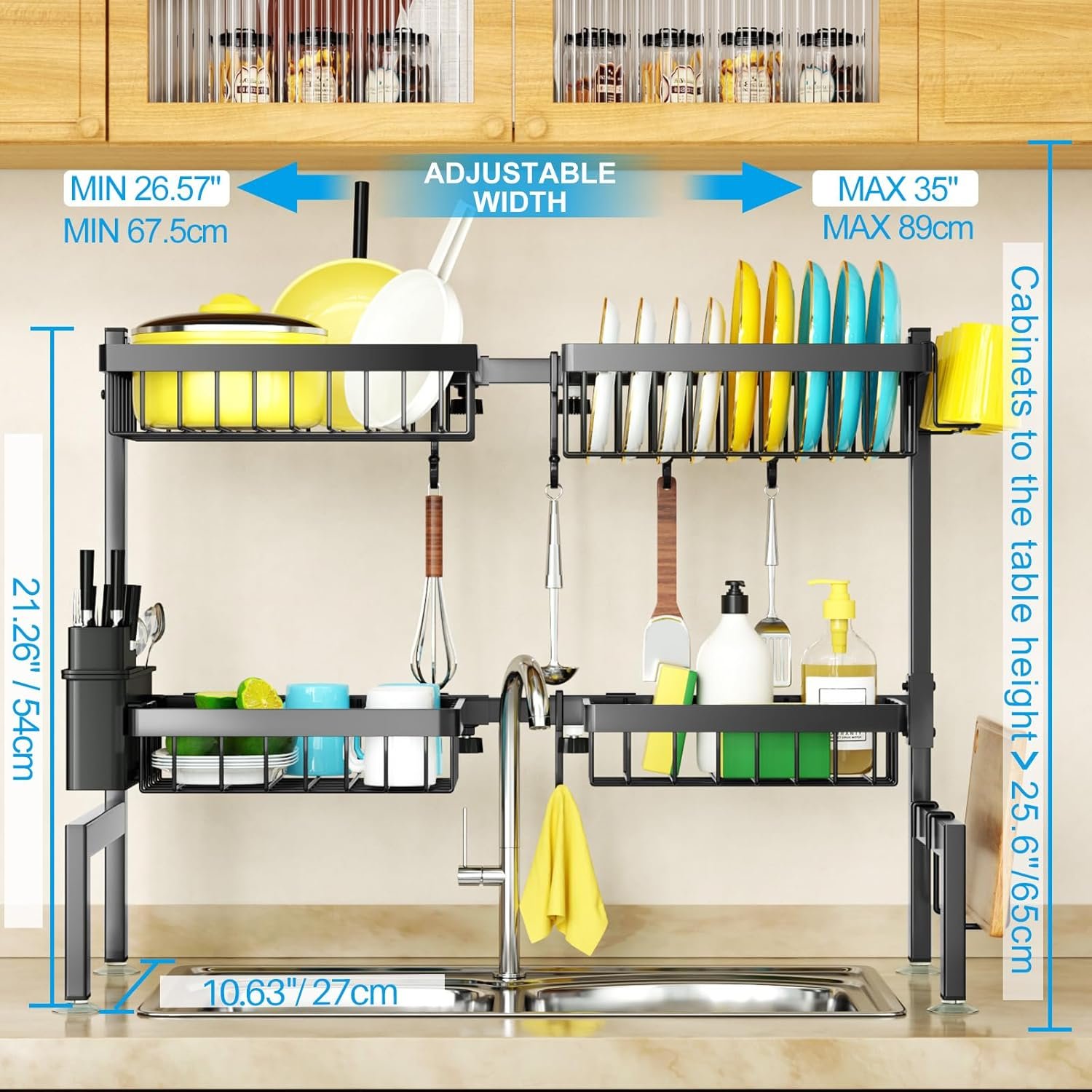 The SNSLXH 2-Tier Over-Sink Organizer Rack is built to eliminate countertop clutter and upgrade your kitchen workflow. Its expandable frame adjusts from 24.8″ to 35.4″, making it compatible with most single and double sinks. You get 4 removable baskets, hooks, a knife holder, cup holder, cutting-board slot, and a drip tray — all designed to keep your daily tools elevated, clean, and within arm’s reach. The steel construction is coated for rust resistance, while the reinforced H-frame and suction-cup feet prevent shaking or tipping. If you want maximum storage in minimum space, this rack is one of the most efficient setups you can put above your sink.